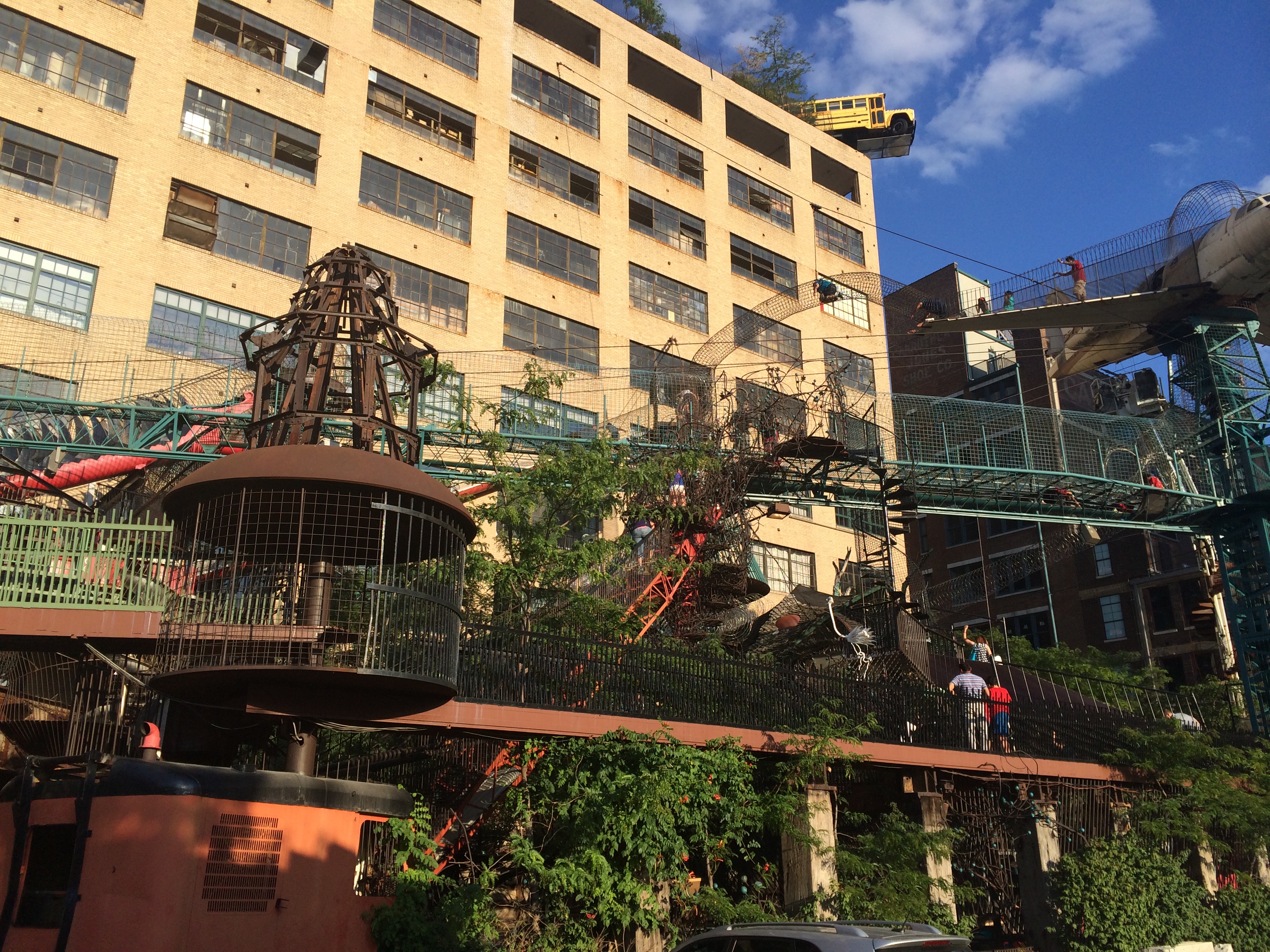 I had lost track of my own kids some time before, but I was pretty sure they were okay – I would see flashes of them running along a rebar bridge or climbing up something impossible. The magical uniqueness of the place lends itself to good will to others; occasionally you will have to pause to unsnag someone else’s kids when you come across them and someone will unsnag or direct yours. A little boy was trying valiantly to unhook his shoelace from some part of the wire structure where he was stuck at an odd angle. I came upon him and freed his shoe. Later on, a helpful preteen (yes, I know what I just said) helped direct me out of some kind of spiraling wood structure. Another parent smiled at me in been-there-done-that sympathy when I hit my head on a low hanging fire truck part. Just be careful where you climb or you’ll end up on the wing of a plane four stories up. No preteen or sympathetic parent can help you down from there.